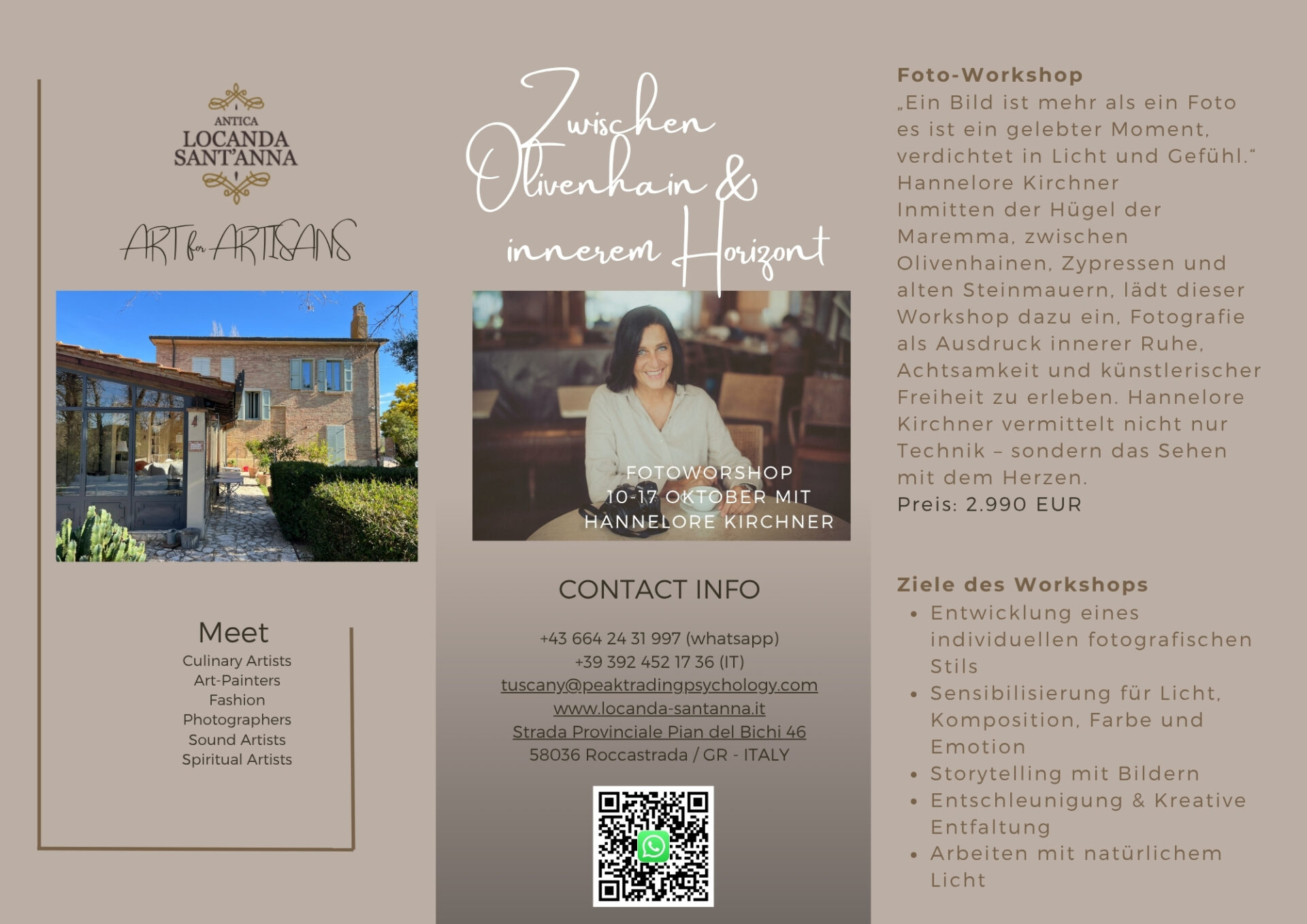 Inmitten der Hügel der Maremma, zwischen Olivenhainen, Zypressen und alten Steinmauern, lädt dieser Workshop dazu ein, Fotografie als Ausdruck innerer Ruhe, Achtsamkeit und künstlerischer Freiheit zu erleben.
