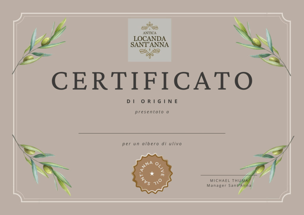 Kosten für die Patenschaft für einen Olivenbaum EUR 300.- pro Jahr (plus Versandkosten innerhalb der EU 25 EUR). Dafür bekommst du 3 Liter hochwertigstes Olivenöl. Bei deinem nächsten Besuch / Übernachtung im Agriturismo Sant’Anna bekommst Du 5% Rabatt (max. 70 EUR)